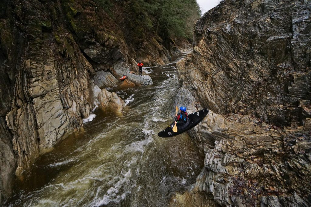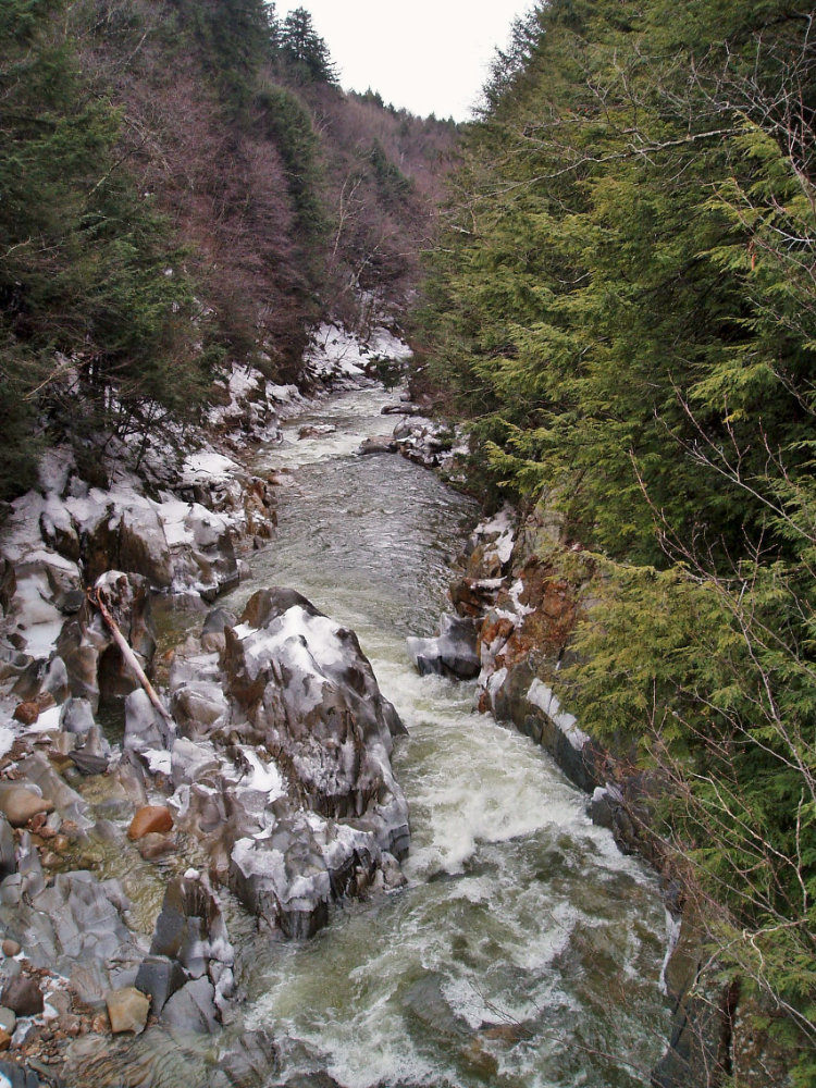 The run begins just underneath the Long Trail footbridge. Here the wide cobble-laden Mill River funnels between bedrock walls as it drops into the upper gorge. While you can easily put in on either side, it is more fun to bounce across the suspension bridge to put in on river left just upstream.